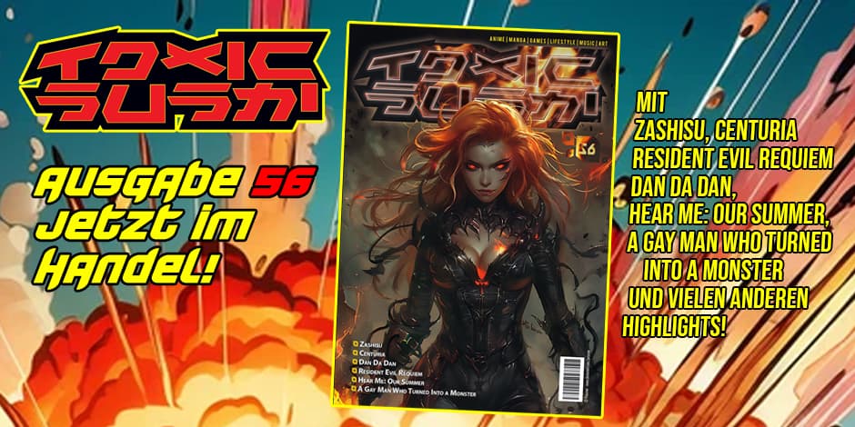 Hurra, Ausgabe 56 ist da! Die Zeiten sind düster, die Welt steht vor dem Untergang. Daher ist Eskapismus anno 2026 wichtiger denn je – wir leisten unseren Beitrag dazu und präsentieren die Asian-Pop-Culture-Highlights des Frühjahrs! Dabei werfen wir einen Blick auf das aktuelle Portfolio von Manga Cult, präsentieren das Live-Action-K-Drama „Hear Me: Our Summer“, rücken noch einmal den Anime-Kracher „Dan Da Dann“ in den Fokus und liefern eine Vorschau auf „Resident Evil Reqiem“, das jüngste Game des kultigen Franchise. Ebenfalls nicht zu kurz kommen neue, hochkarätige Manga-Veröffentlichungen, darunter „A Gay Man Who Turned Into a Monster“, „Zashisu“, „Centuria“ sowie „Playing Death Games To Put Food On The Table: Das Phantom-Mädchen im Spiel des Todes“. Darüber hinaus beleuchten wir die Wiederveröffentlichungen einiger Anime-Klassiker von Ausnahmeregisseur Mamoru Hosoda, die in schicken Special-Editions erscheinen. Wer schon mal einen digitalen Blick ins Mag werfen möchte, der kann dies hier tun, die Print-Ausgabe erscheint wie immer im kultigen A-5-Format mit partiell lackiertem Cover! Erhältlich ist Toxic Sushi beim Händler Deines Vertrauens, auf einschlägigen Conventions sowie hier in unserem Shop.